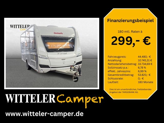 SONDERAUSSTATTUNG: Styling-Paket silber (Einachser) (Außenblech in Glattblech titansilber-metallic, 17" Alufelgen im Dethleffs-Design (Einachser), Deichselabdeckung, Großflächige Abstützfüße, 4 St., Vollgummi-Stützrad mit Stützlastanzeige, Rangiergriffe in Chrom-Ausführung, Heckleuchtenträger mit hohem Aufsatz und Dachreling, Bugfront mit hohem Aufsatz und Dachreling) Dusch-Paket (Duschausstattung inkl. Duscharmatur und -vorhang, City-Wasseranschluss) Sicherheitspaket (ATC Trailer Control, Sicherh.-Gasdruckregl. DuoControl mit Crash Sensor und Gasreglerbeheizung EisEx, Rauchmelder) Wasser- und Elektrik-Autark-Paket Combi 4 (Warmluftheizung Combi 4 G/E inkl. Digitalbedienteil, Elektrik-Autark Ausstattung, Frischwassertank 70 Liter) Rangierhilfe Mover für Einachser Vorbereitung für Flachbildschirm (Antennenkabel und TV-Halter) Multifunktions-Außenanschluss 12V, 220V, TV und SAT Rahmenfenster (nicht möglich für Bug- und Heckfenster) Dach-Casettenmarkise 4000x2500 mm, manuell Bettumbau Einzelbetten zu Doppelbett Backofen Auflastung 1.800 kg (inkl. Stahlrad 195 R14 C LI106) Heckfenster Stauraumklappe vorne rechts 1069x299 mm Stauraumklappe vorne links 1069x299 mm Bettrost mit aufstellbarem Kopfteil Dunstabzugshaube Ein sehr gut ausgestatteter Wohnwagen der beliebten Dethleffs-NOMAD-Baureihe. Durch das Styling-Paket mit Glattblech und 17" LM-Felgen hebt er sich optisch edel auf jedem Campingplatz hervor. Zu den weiteren Vorzügen des 510 L gehören die großzügige Küche und die vielen Stauraumoptionen. Mit der Auflastung auf 1,8 t hat er zudem auch ordentlich Zuladungsreserven. Hinzu kommt der einmalige Herbst-Sonderpreis!